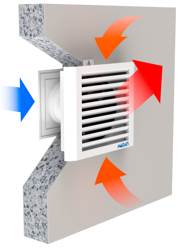 Mobair 2030S – kiertoilmalla lämmittävä korvausilmalaite – on erityinen siksi, että ulkoa tuleva kylmä ilma lämpenee katonrajassa olevan lämpimän ilman avulla. 1.0 W tehoinen puhallin saa aikaan huoneilman ja ulkoa tulevan ilman sekoittumisen, joten energiankulutus on erittäin alhainen. Patentoitu rakenne takaa vedottoman lopputuloksen.