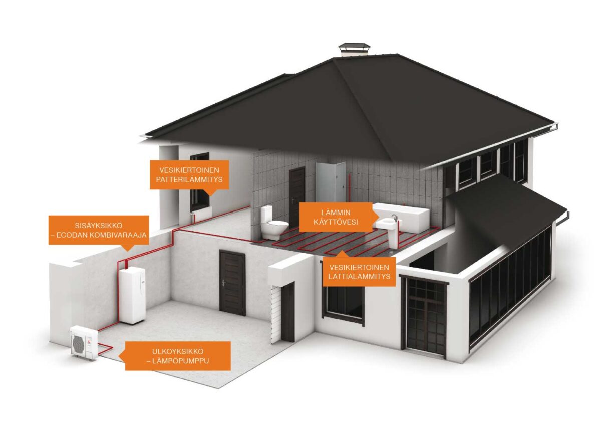 Mitsubishi Electric ilma-vesilämpöpumppu on koko talon tehokas ja taloudellinen lämmitysjärjestelmä, jolla lämmität myös tarvittavan käyttöveden suurimmalla mahdollisella hyötysuhteella.